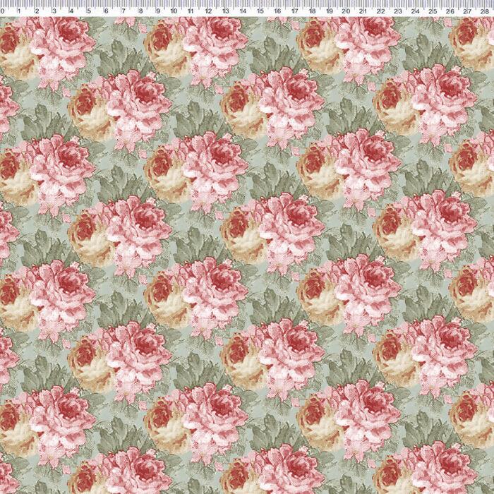 Descrição Tecido Tricoline Millyta Vergara Rosas Médias Fundo Verde