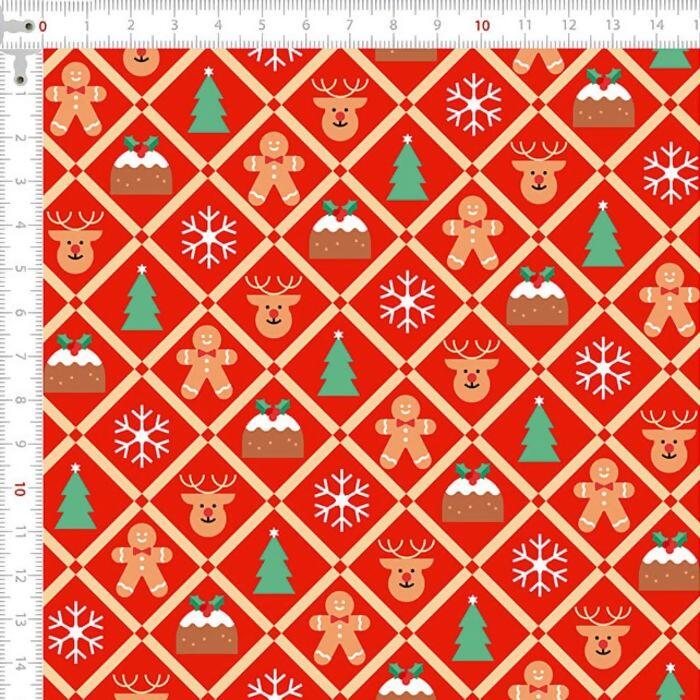 Descrição Tecido Tricoline Natal Doces Fundo Vermelho