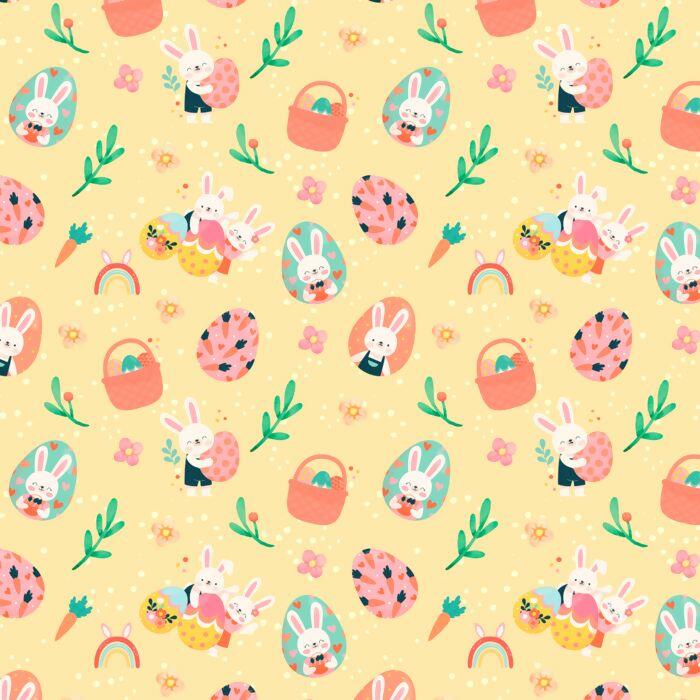 Tecido Tricoline Páscoa Cestas de Ovos e Coelhos Fundo Amarelo