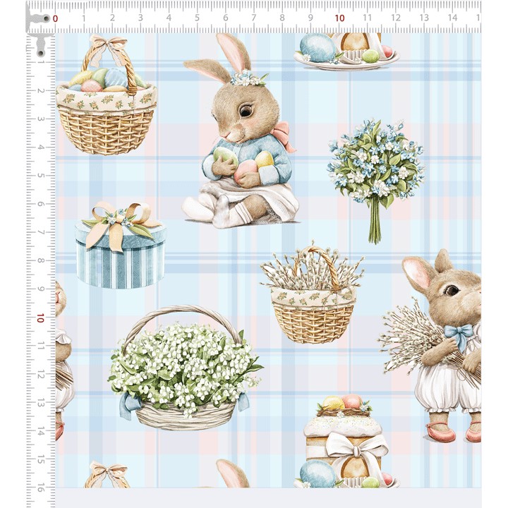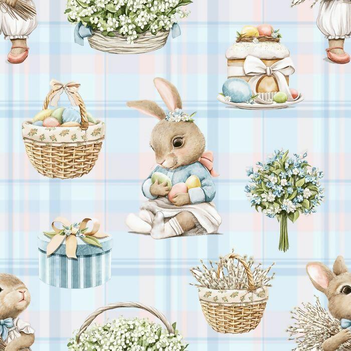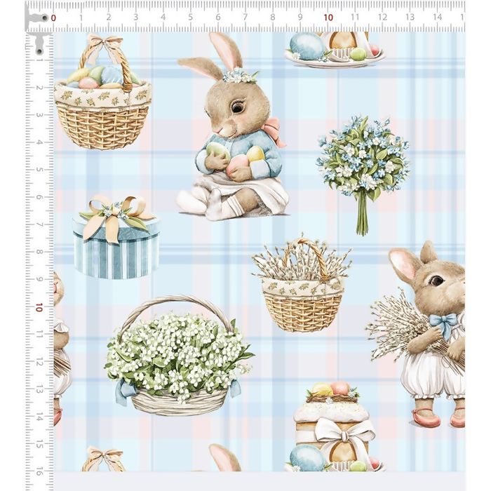 Descrição Tecido Tricoline Páscoa Cestas Fundo Xadrez Azul