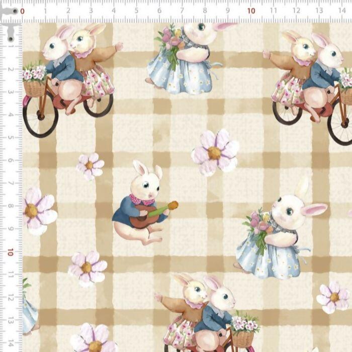 Descrição Tecido Tricoline Páscoa Coelhos e Bicicleta