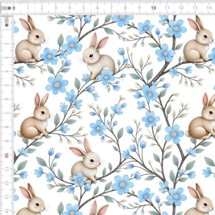 Tecido Tricoline Páscoa Coelhos Flores Azuis