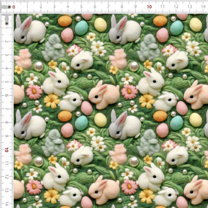 Descrição Tecido Tricoline Páscoa Coelhos Flores e Pérolas