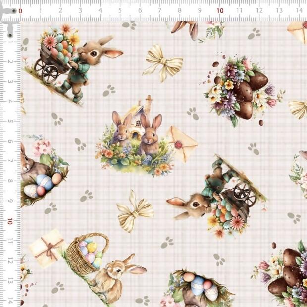 Descrição Tecido Tricoline Páscoa Coelhos Ovos e Flores