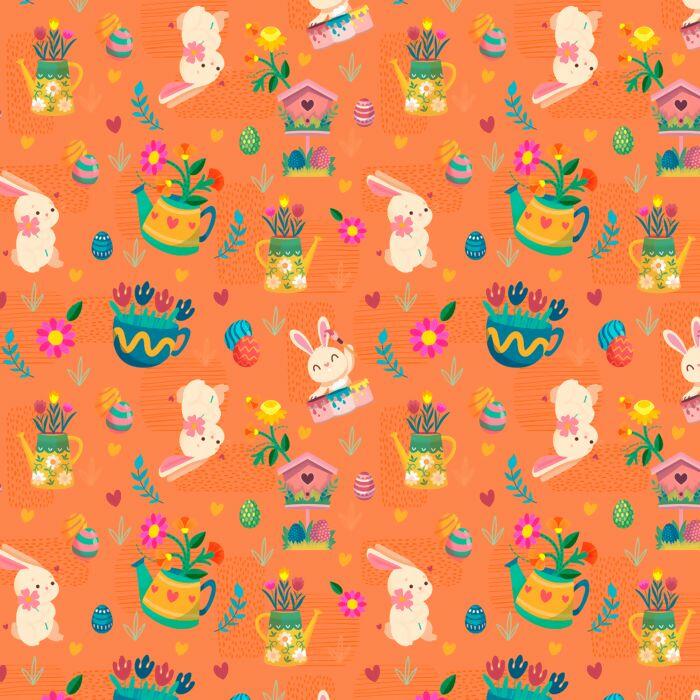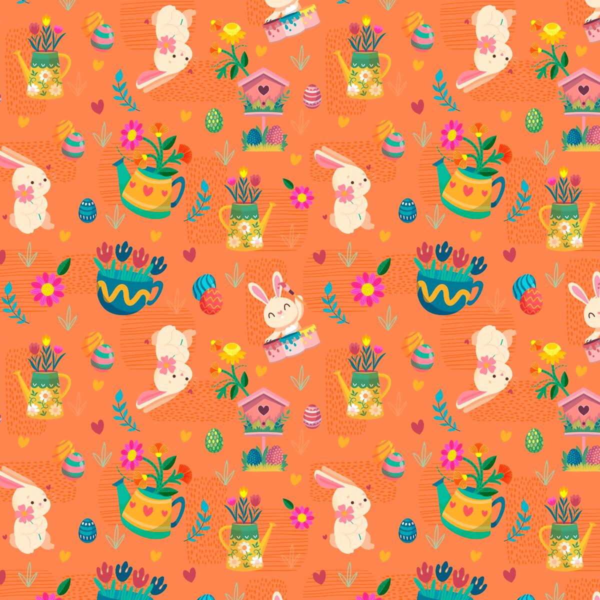 Tecido Tricoline Páscoa Jardim Coelhos Fundo Laranja