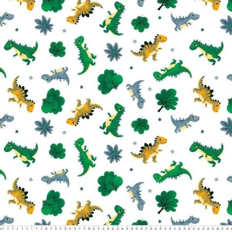 Descrição Tecido Tricoline Tiranossauro Rex Verde e Bege