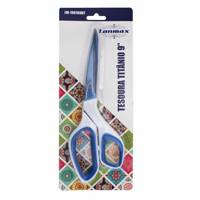Tesoura de 9 polegadas com lâmina banhada em titânio e cabo emborrachado. Pode ser utilizada em tecidos, papel, EVA e outros artigos para artesanato.