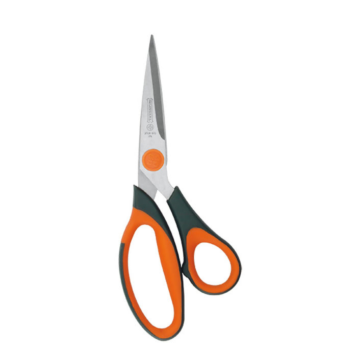 Tesoura com lâmina em aço inox e cabo emborrachado nas cores grafite e laranja. Indicada para cortes em geral de uso doméstico.