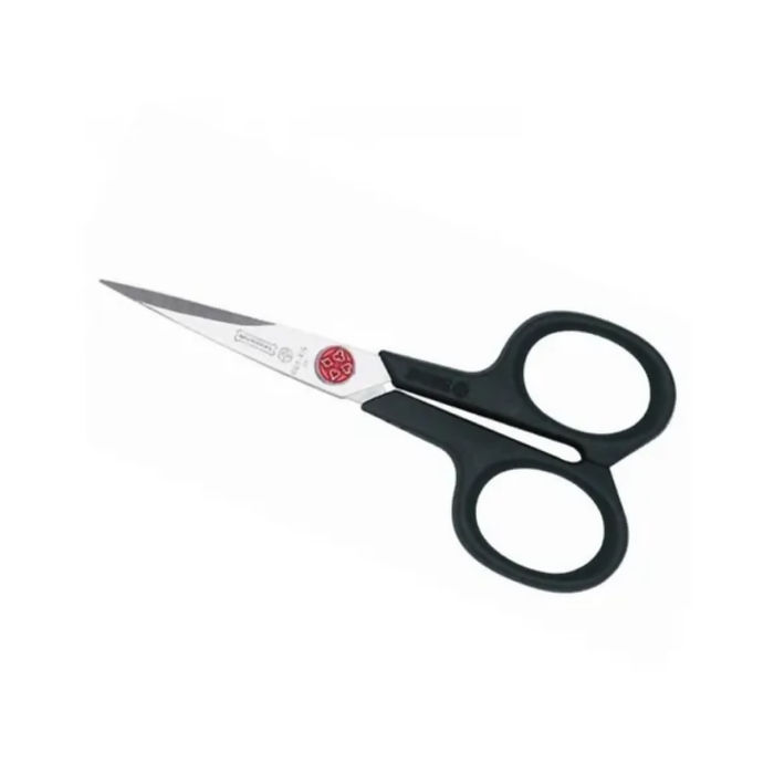 Tesoura para bordar com lâmina em inox e cabo em nylon na cor preta. Indicada para abertura de botões, trabalhos e acabamentos de bordado.